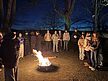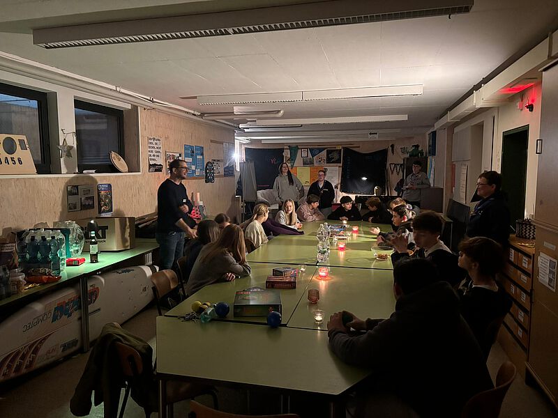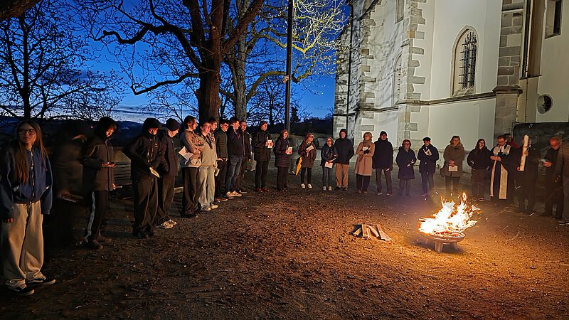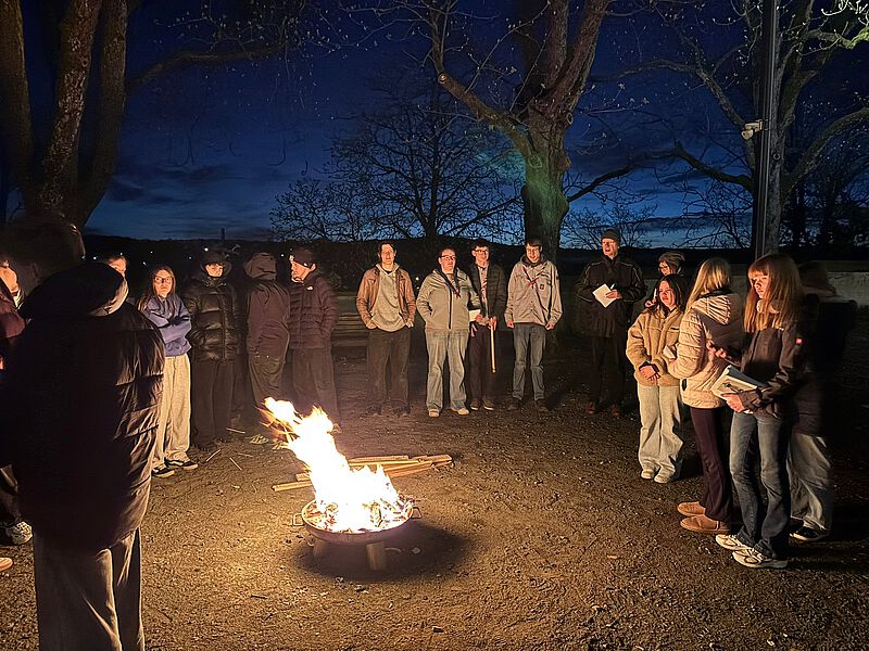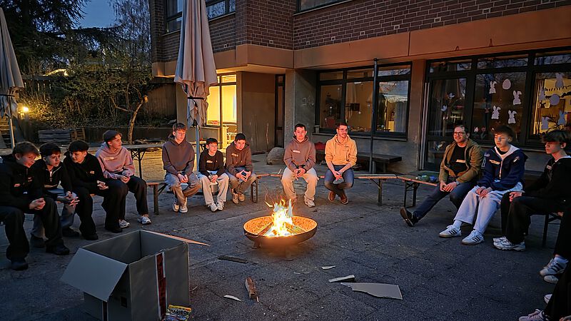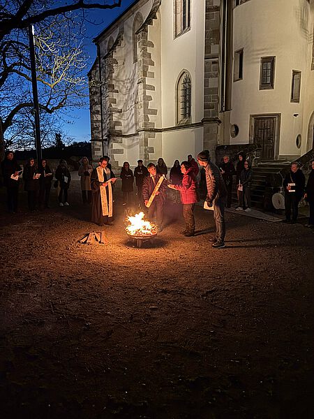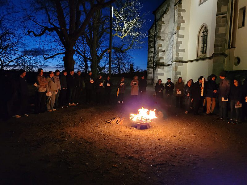 Wie seit 3 Jahren üblich Pfadis und Konfirmanden verbringen gemeinsam die Osternacht am Gemeindehaus mit Andachten, Feuer, Filmen, Spielen, Knabbersachen, wenig Schlaf und besuchen am frühen Ostersonntag den Gottesdienst. Vor dem Gottesdienst in der Kirche startet man mit dem Osterfeuer auf dem Freithof - das Feuer klein aber fein in einer Feuerschale, nach ca. 20 Minuten wird daran die Osterkerze entzündet die dann mit in die dunkle Kirche einzieht. Das Feuer ist heruntergebrannt, Deckel drauf - Feuer aus - so braucht es keine Wache am Feuer und alle gehen in die Kirche.